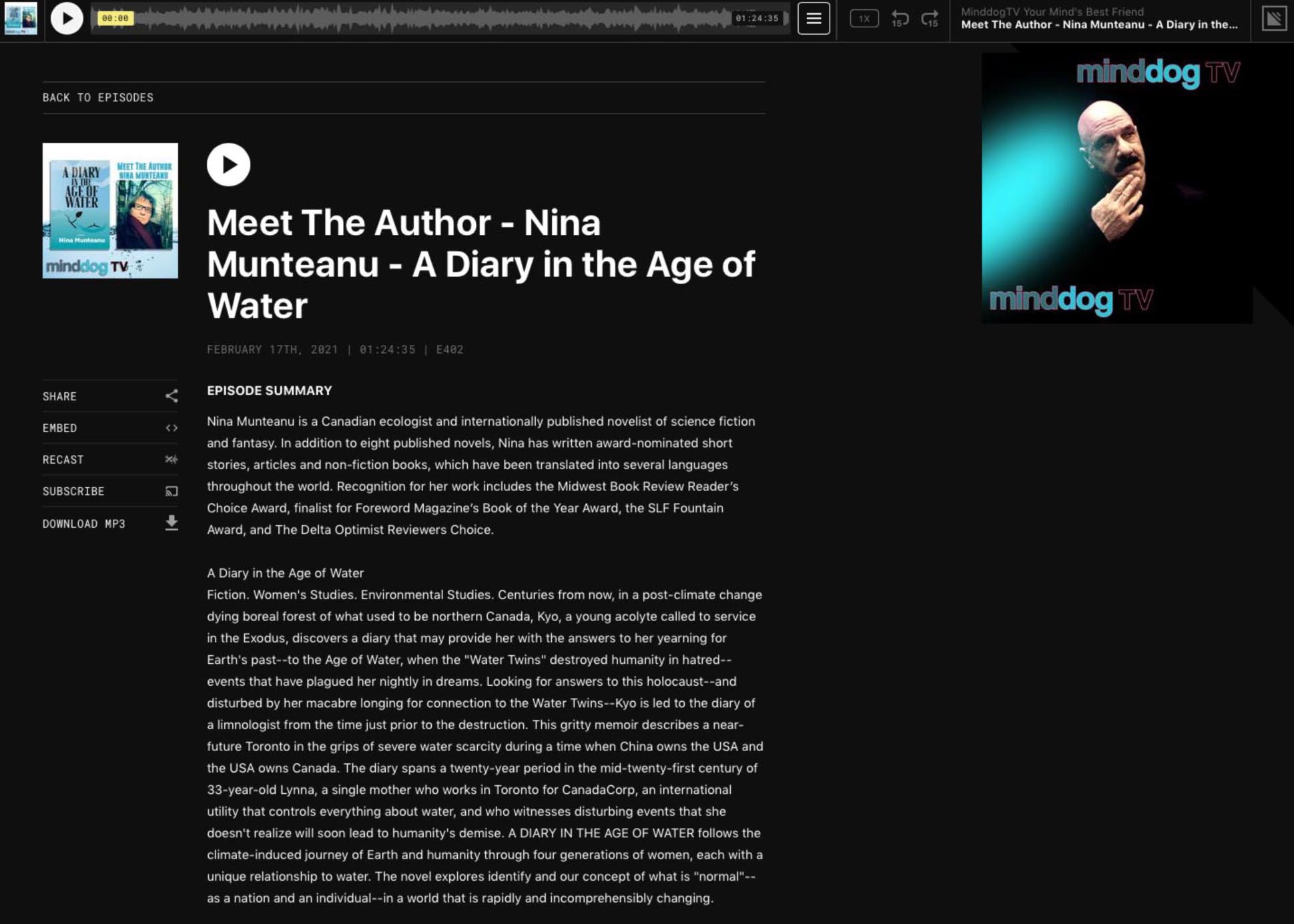 I was recently interviewed by Matt Nappo on Minddog TV in New York, where we talked about the science and magic of water, climate change and how to not become cynical, the process of writing, what scares us and what takes us through it into great storytelling.