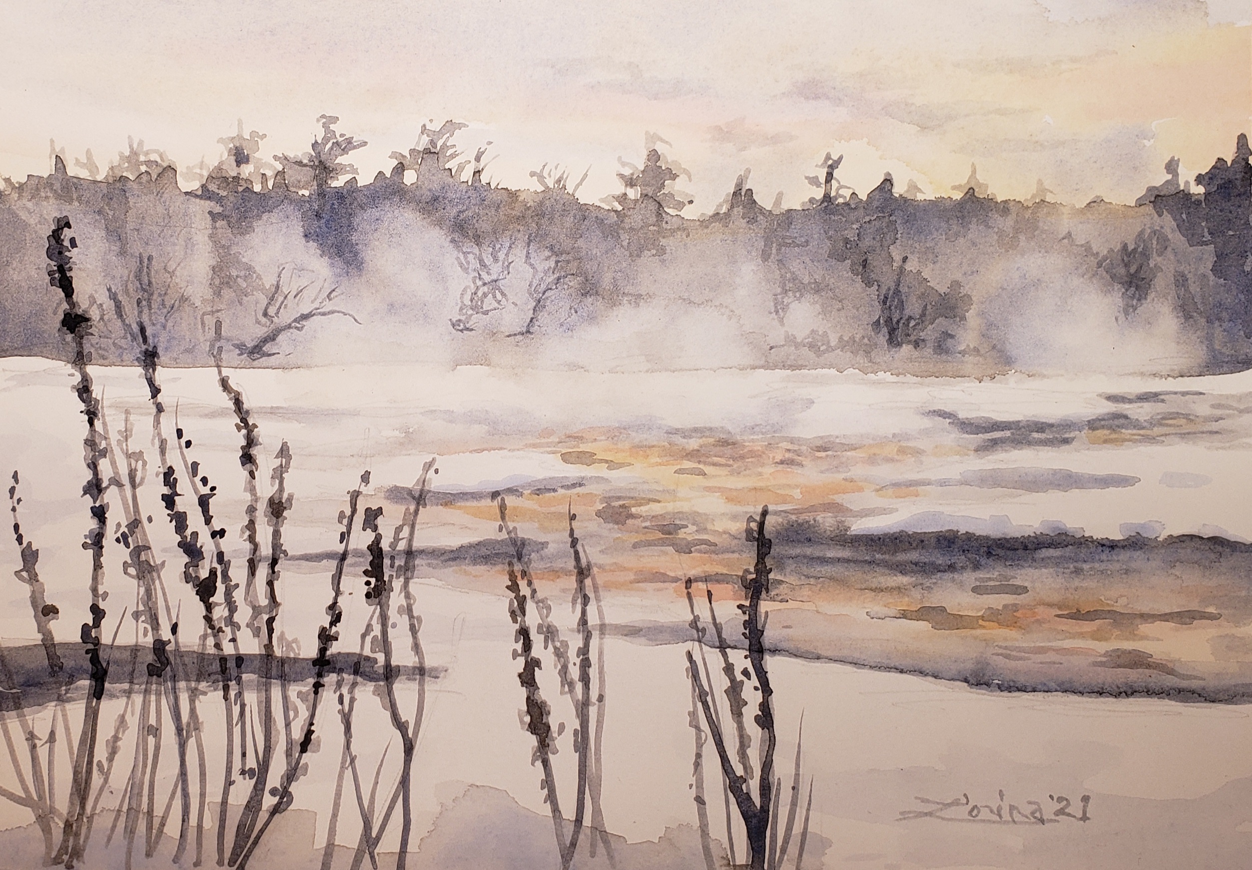 Lorina mostly works in landscapes, often with lakes and rivers, icons of a water-rich nation. “We are such a remarkable land of water,” she says. “Our geography is breathtaking.” Atmospherics—weather—fascinates Lorina. “I love the challenge of bringing that sense of fog, or mist, or rain, or even crisp, clear air to a painting, of making the viewer feel they are there, without resorting to magic realism. I like to tuck my work somewhere comfortably between realism and impressionism.”
