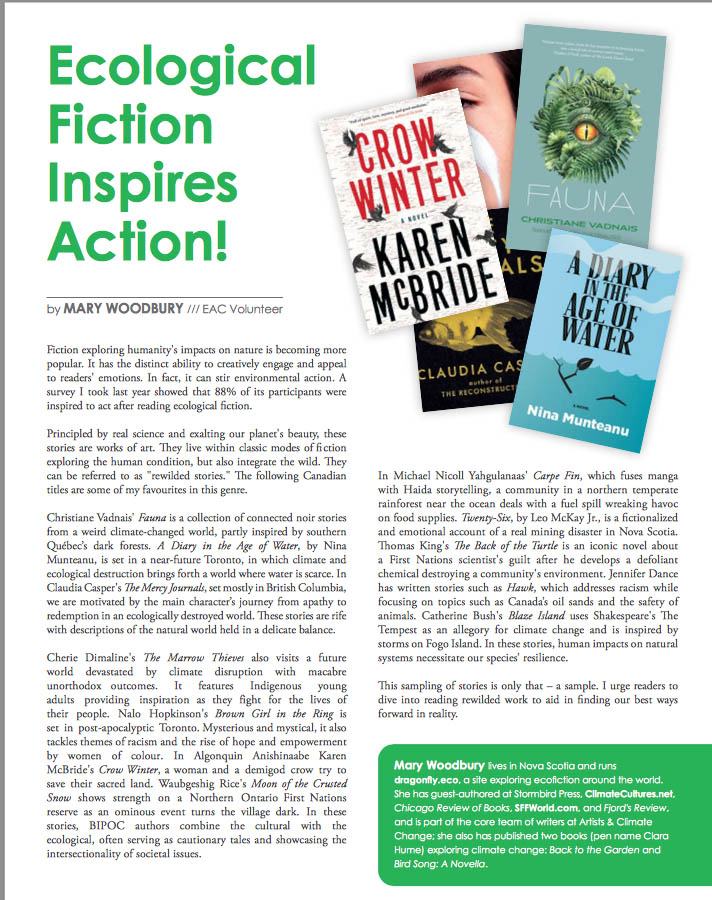 In the Spring 2021 Issue of Ecology & Action, author and Dragonfly.eco publisher Mary Woodbury lists some of her favourite eco-fiction that inspires action. Nina Munteanu’s clifi eco-novel “A Diary in the Age of Water” is among them: