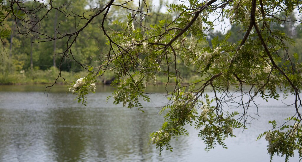As I sit, eating my lunch and breathing in the ambrosia fragrance of black locust blooms, a young man paddles his canoe past the café. Soon after, a family of geese, adults flanking seven goslings, paddle leisurely by. Gulls cry out and gather on one of the small islands as a freight train lumbers over the old rail/footbridge downstream. A robin hops close to my table, looking for crumbs and I clumsily drop a seed from my multi-grain sandwich… Oops! Darn, I wanted that…