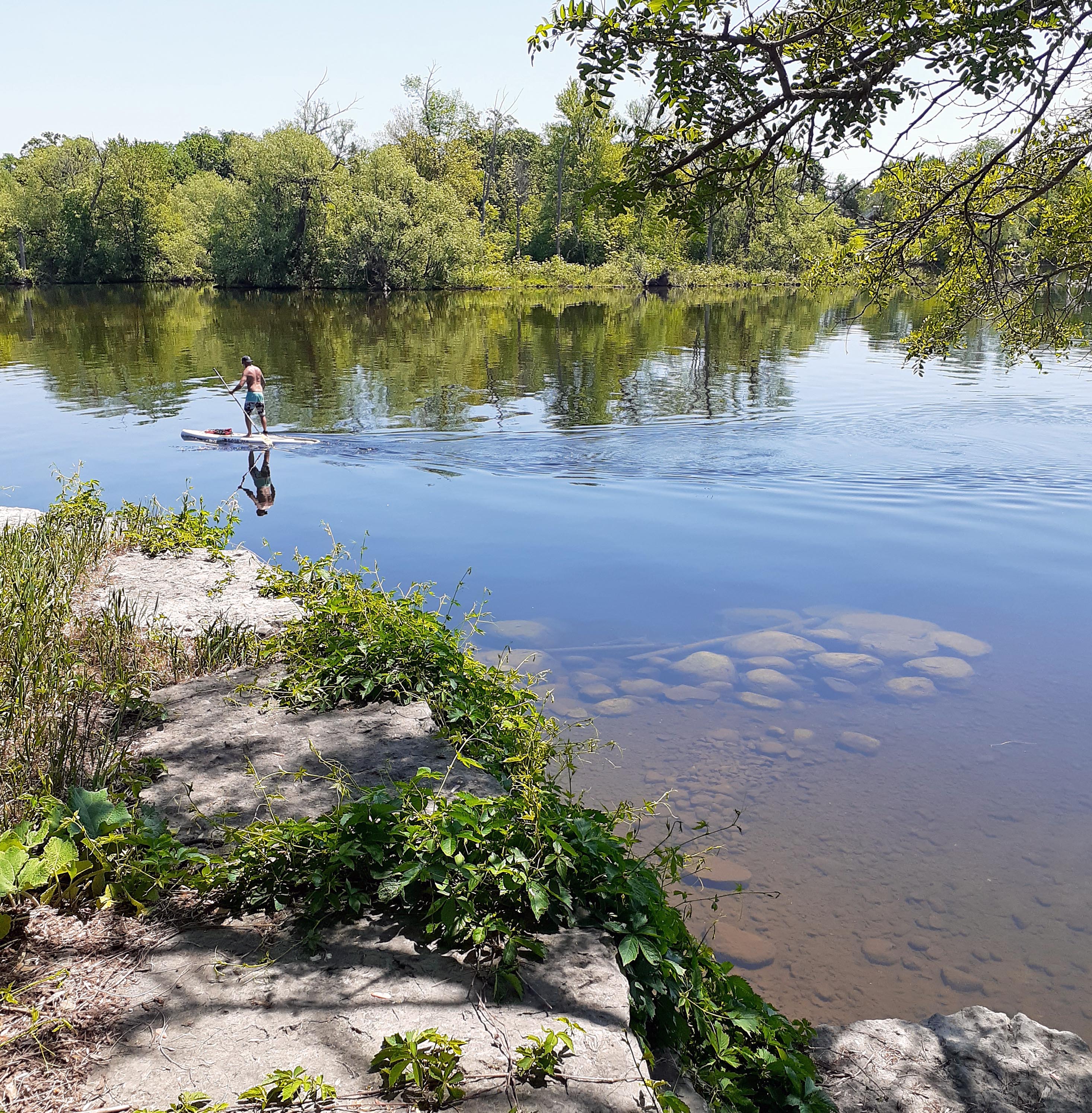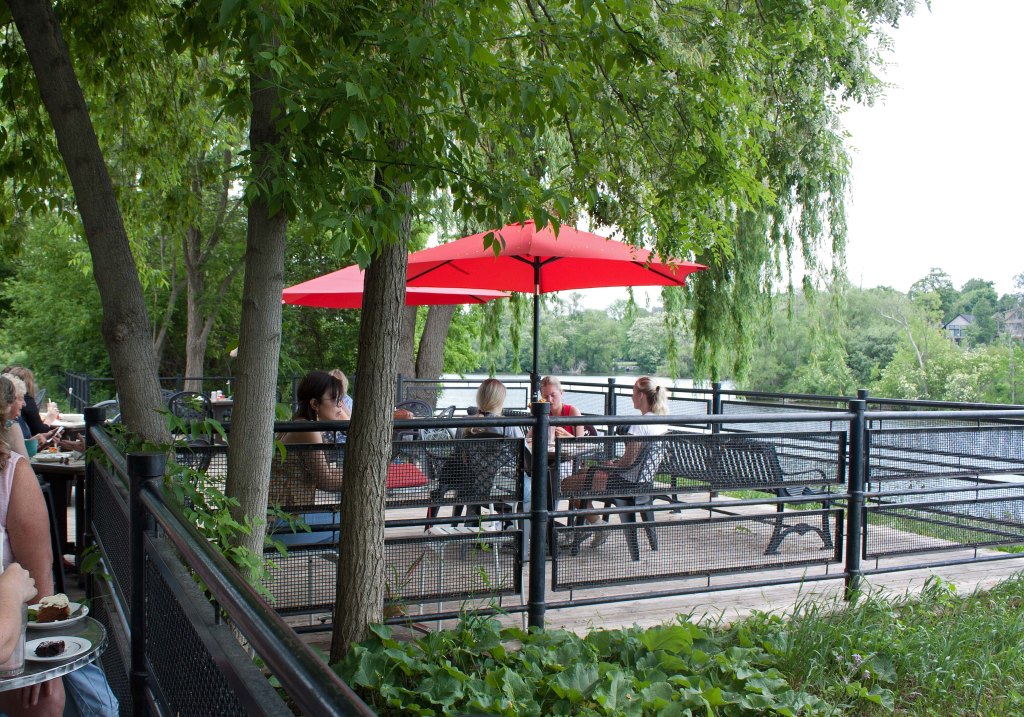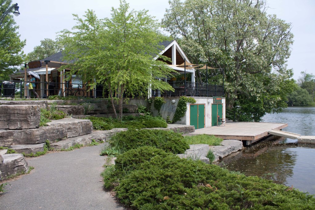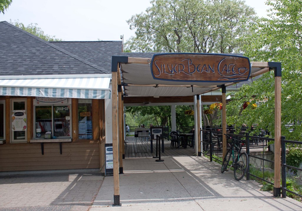The Silver Bean Café fills that requirement wonderfully. It’s a café situated at a dead end of King Street within a linear riparian park (Millennium Park) on the banks of the river with a large side-park patio under a canopy of willows, black locust, and Manitoba maples. They know what they are too: they call themselves “your waterfront cottage in the city.” When I sit on the patio, enjoying my lunch under the dappled shade of a flowering black locust tree with a view of the river, I hear only birds and the desultory chatter of fellow patrons. And yet, the city is right there, next to this riparian park.