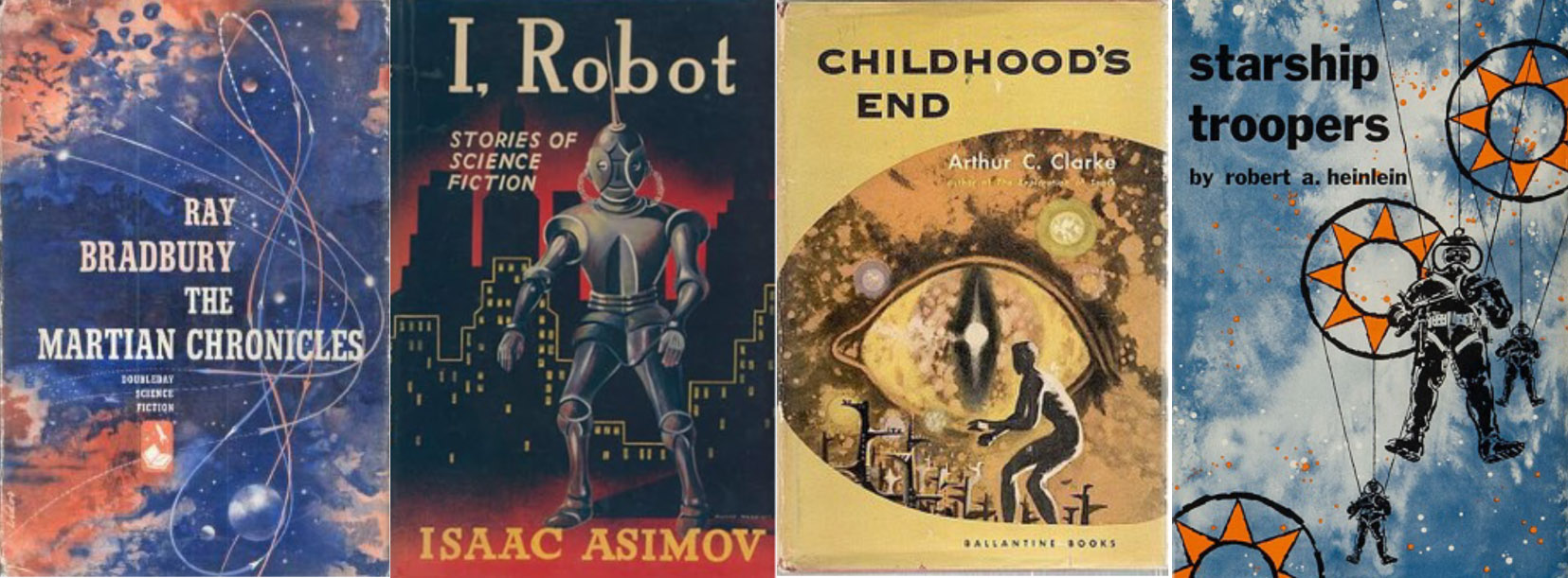First edition book covers of Martian Chronicles (Doubleday, 1950); I, Robot (Grayson & Grayson, 1952); Childhood’s End (Ballantine Books, 1953); and Starship Troopers (G.P. Putnam’s Sons, 1959)