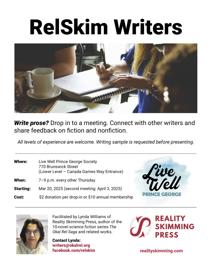 Lynda Williams, author of science fiction series The Okal Rel Saga and publisher of Reality Skimming Press has just pulled together a writers group in Prince George, B.C., for writers to connect with other writers and share feedback on fiction and nonfiction.