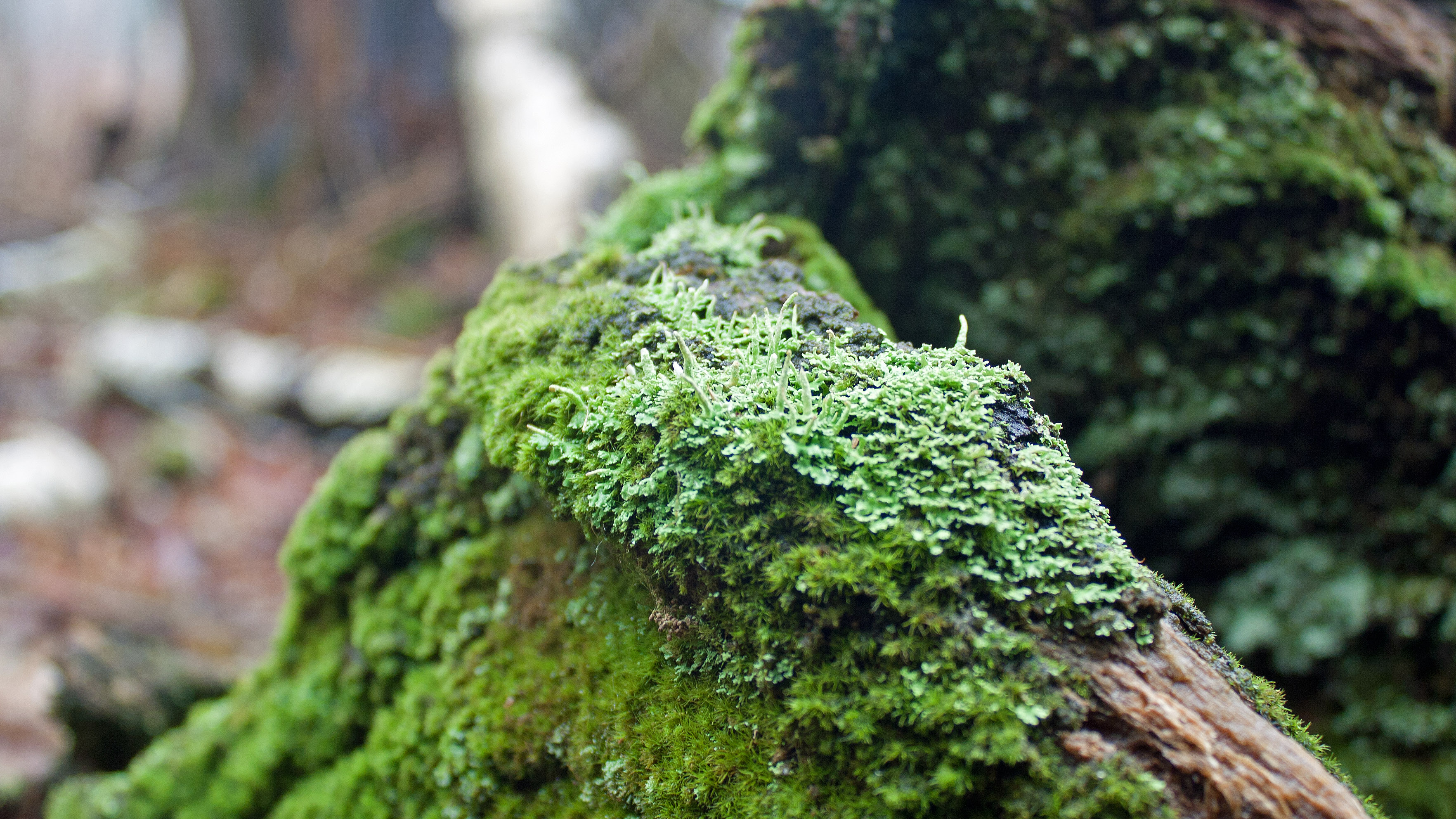 Moss and lichen cover an old cedar log, Trent Nature Sanctuary, ON (photo by Nina Munteanu)