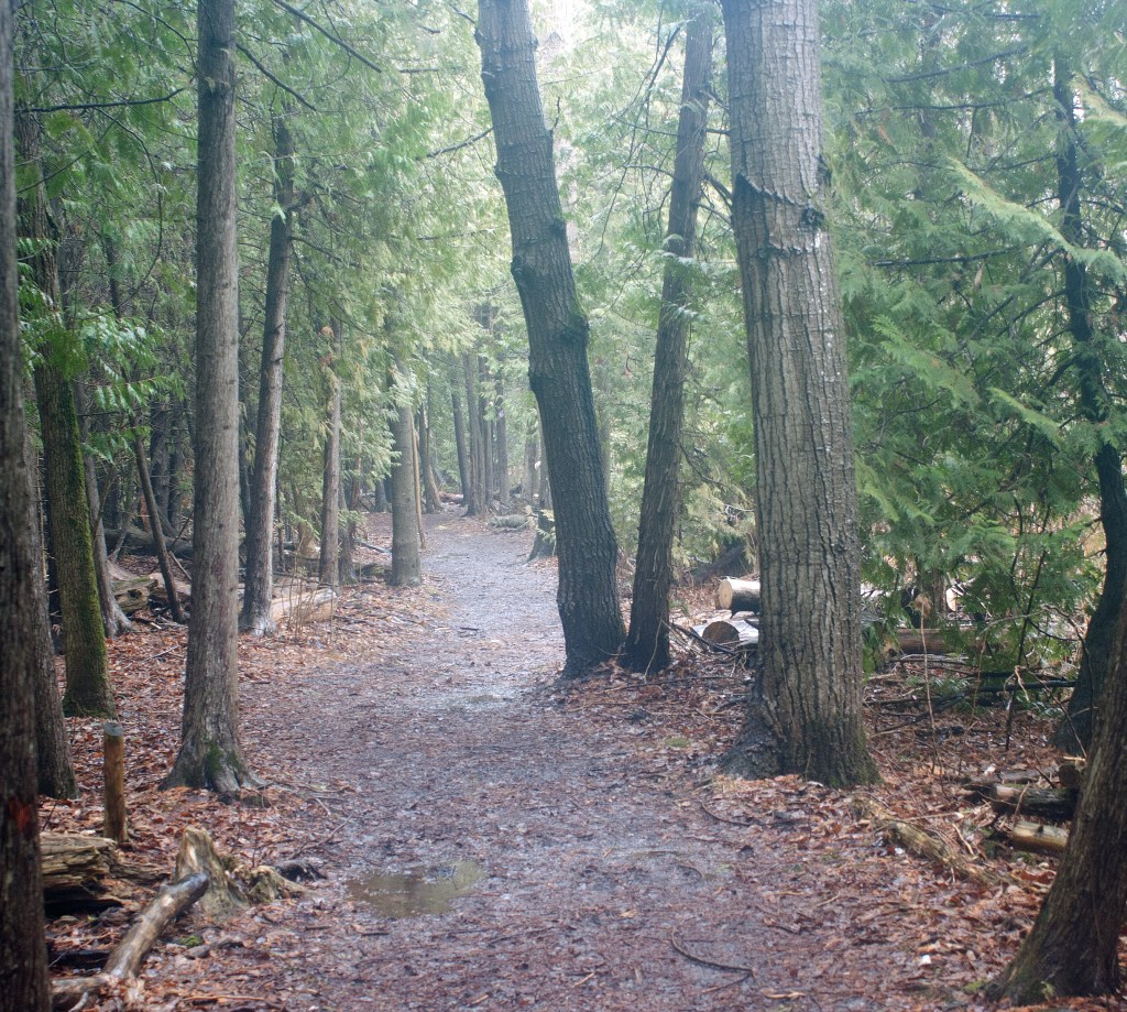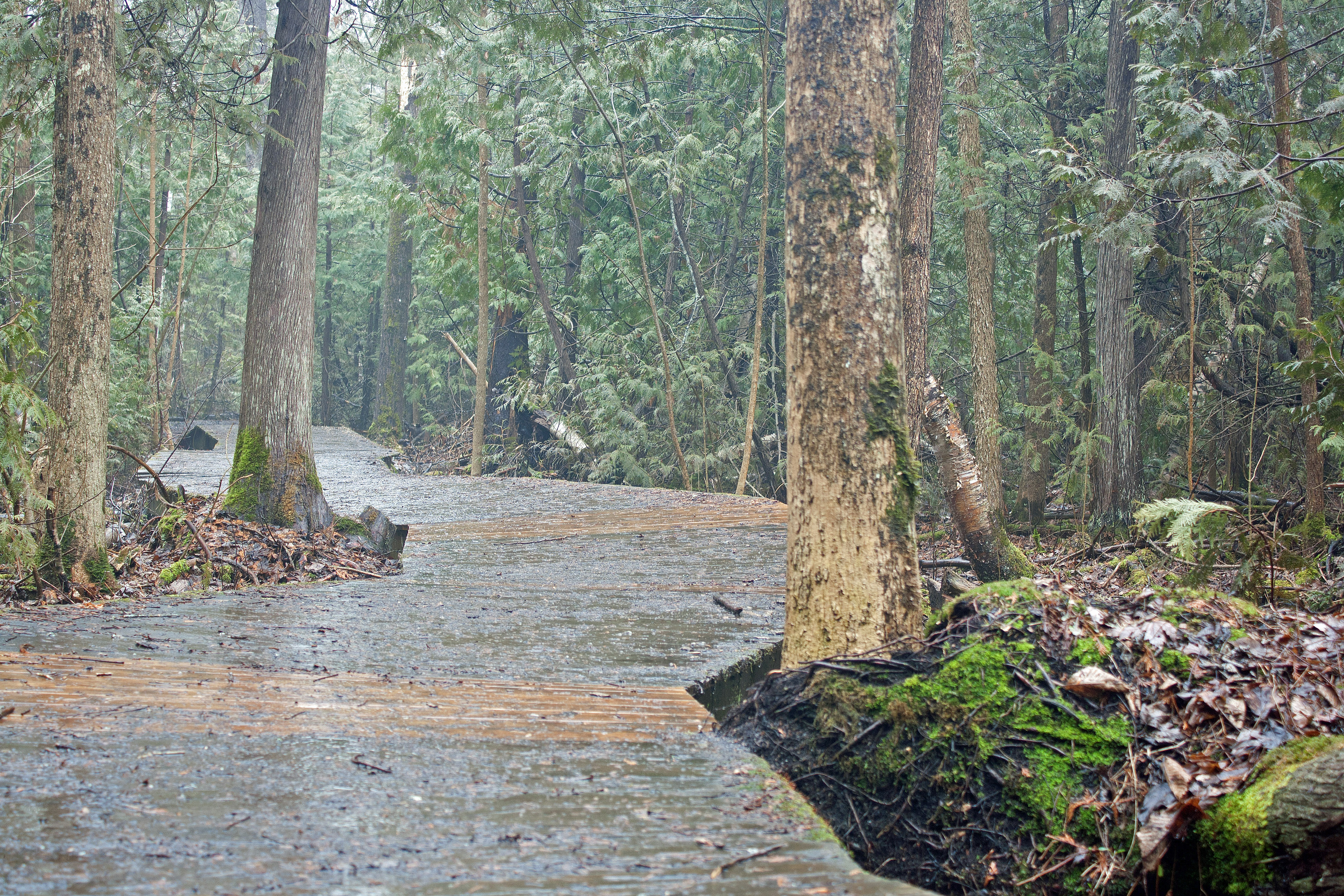 Cedar boardwalk in a misty rain, Trent Nature Sanctuary, ON (photo by Nina Munteanu)