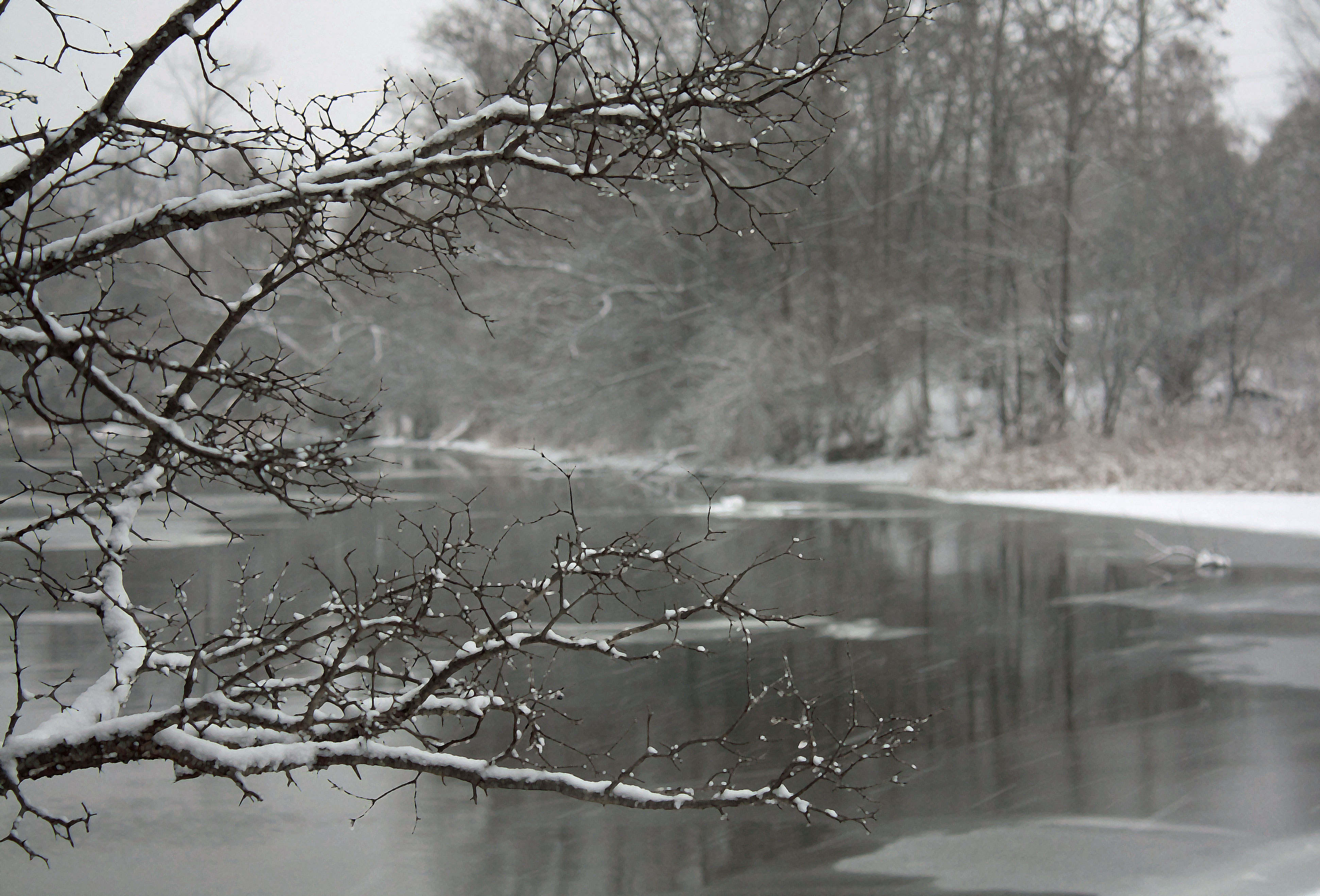 Tree branches overlook river during snowfall, ON(photo and rendition by Nina Munteanu)