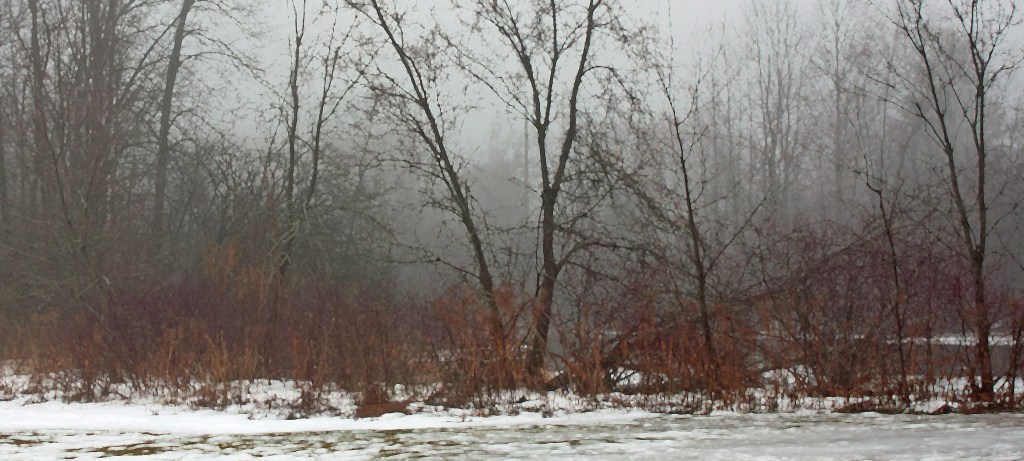 Dogwood shrubs and trees line a marsh in Ontario (photo and rendition by Nina Munteanu)
