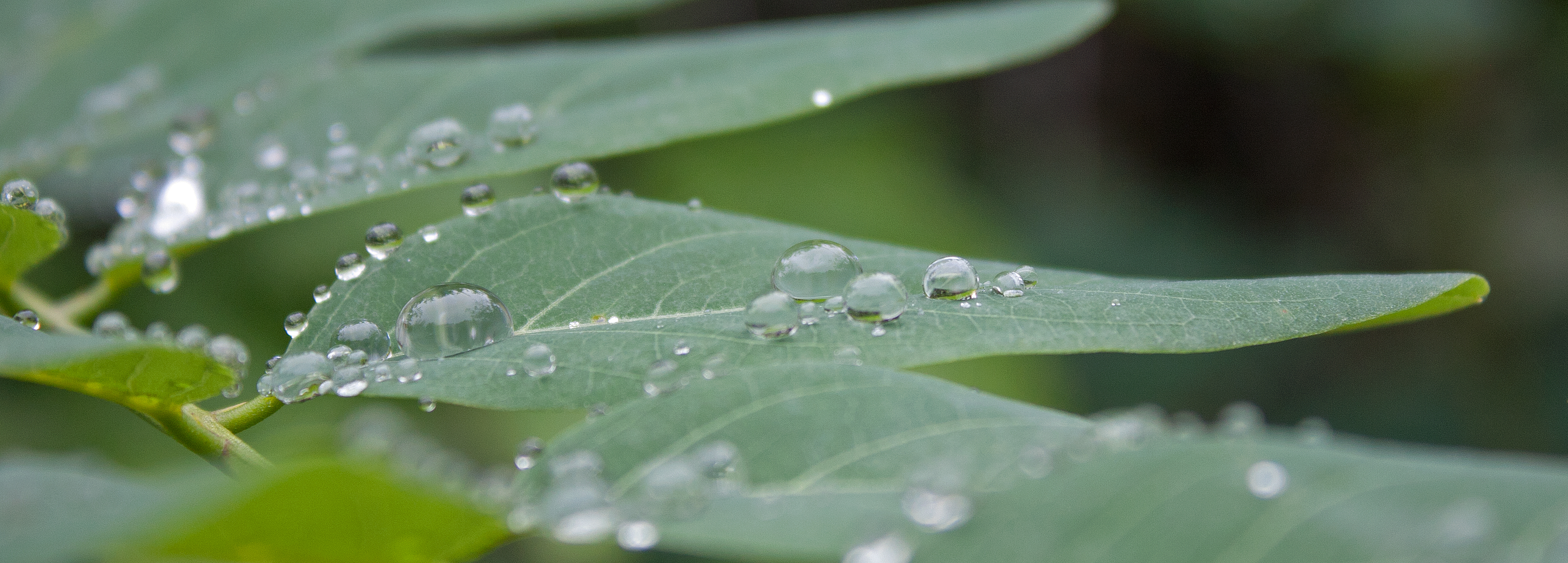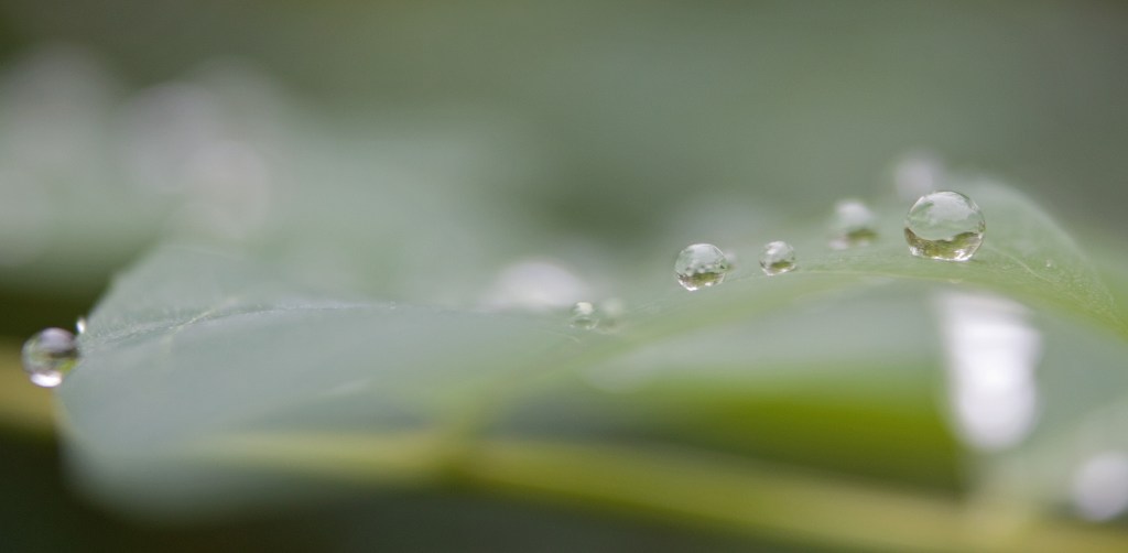 Raindrops ‘float’ on a black locust leaf in a light rain, ON (photo by Nina Munteanu)