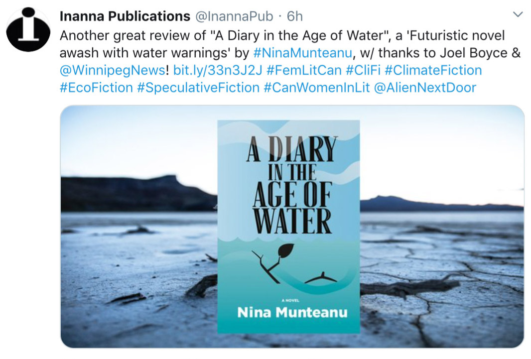 Nina Munteanu is a Canadian ecologist / limnologist and novelist. She is co-editor of Europa SF and currently teaches writing courses at George Brown College and the University of Toronto. Visit www.ninamunteanu.ca for the latest on her books. Nina’s bilingual “La natura dell’acqua / The Way of Water” was published by Mincione Edizioni in Rome. Her non-fiction book “Water Is…” by Pixl Press(Vancouver) was selected by Margaret Atwood in the New York Times ‘Year in Reading’ and was chosen as the 2017 Summer Read by Water Canada. Her novel “A Diary in the Age of Water” was released by Inanna Publications (Toronto) in June 2020.