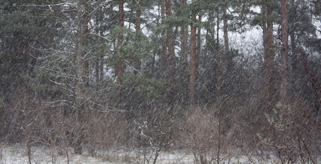 Heavy snow day in Scots Pine forest, ON (photo and rendition by Nina Munteanu)