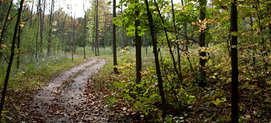 Path through maple beech forest, ON (photo and rendition by Nina Munteanu)
