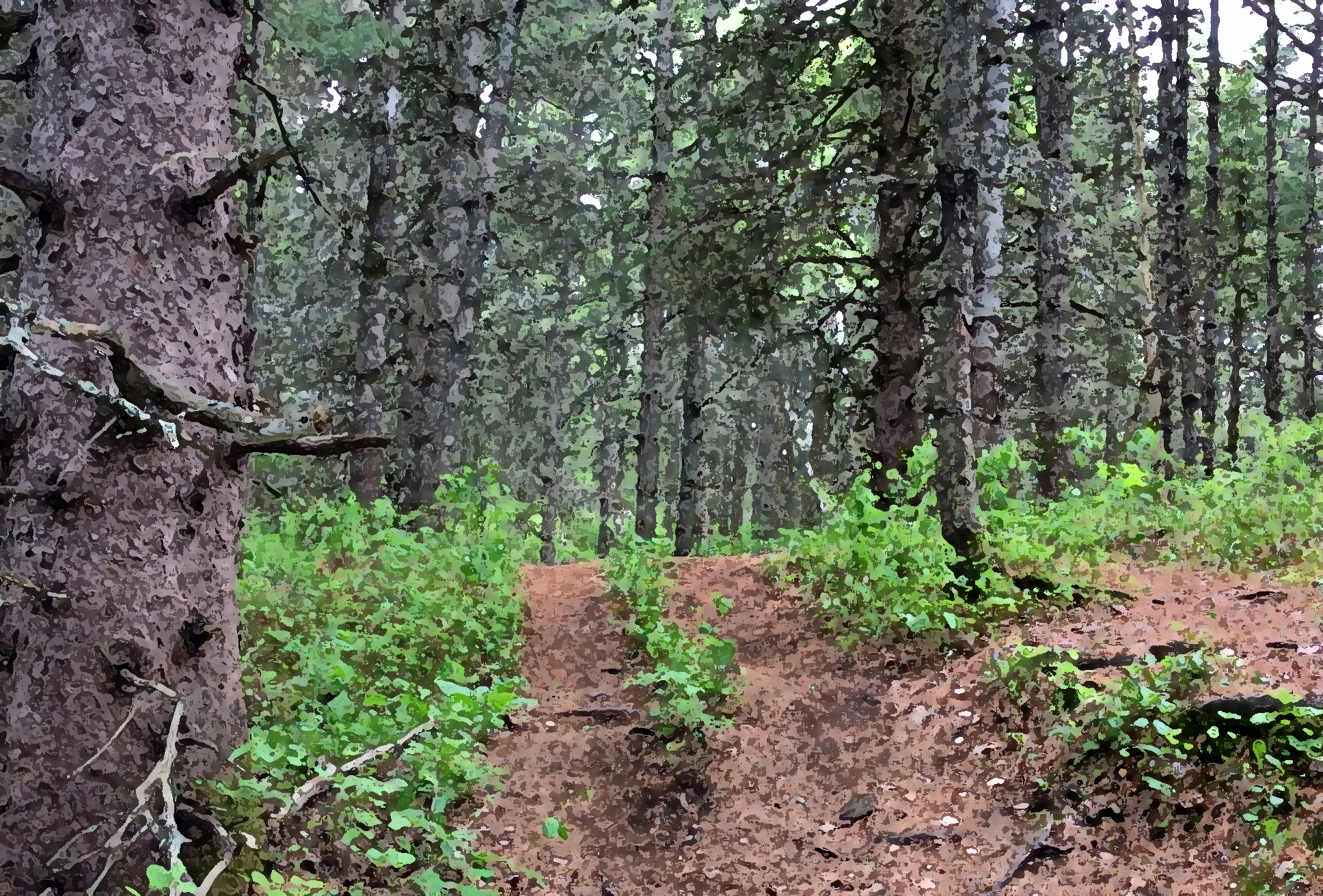 Path through red pine forest, ON (photo and rendition by Nina Munteanu)