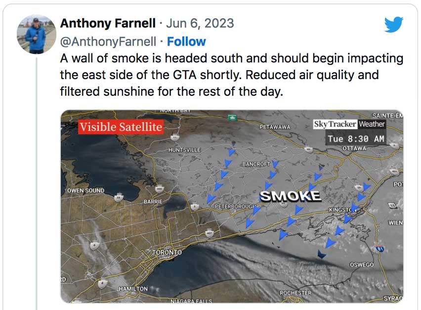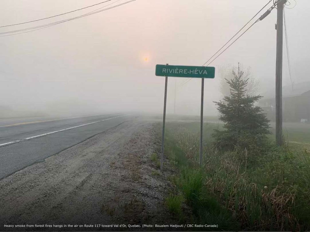 Today, the Ontario government reported heavy smoke conditions in the Northeast Region due to a large number of fires in eastern Ontario and Quebec—with fires worse than usual this year in Quebec. More than 160 fires are burning, most out of control, in Quebec. Smoke drift is travelling as far as just north of Timmins, down through Sudbury and past Parry Sound. Environment Canada issued Air quality warnings today for Peterborough, where I currently live.