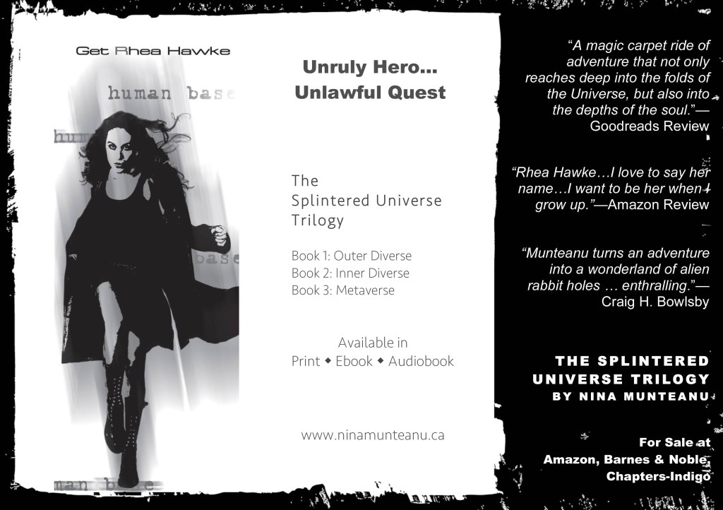 Get Rhea-HawkeGOODLast but certainly not least, Nina Munteanu’s Outer Diverse, the first volume of the Splintered Universe series, introduces Galactic Guardian Rhea Hawk, who investigates the massacre of an entire spiritual sect, catapulting her into a treacherous storm of politics, conspiracy and self-discovery.