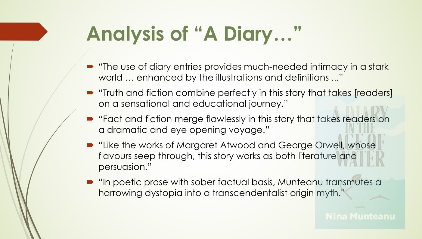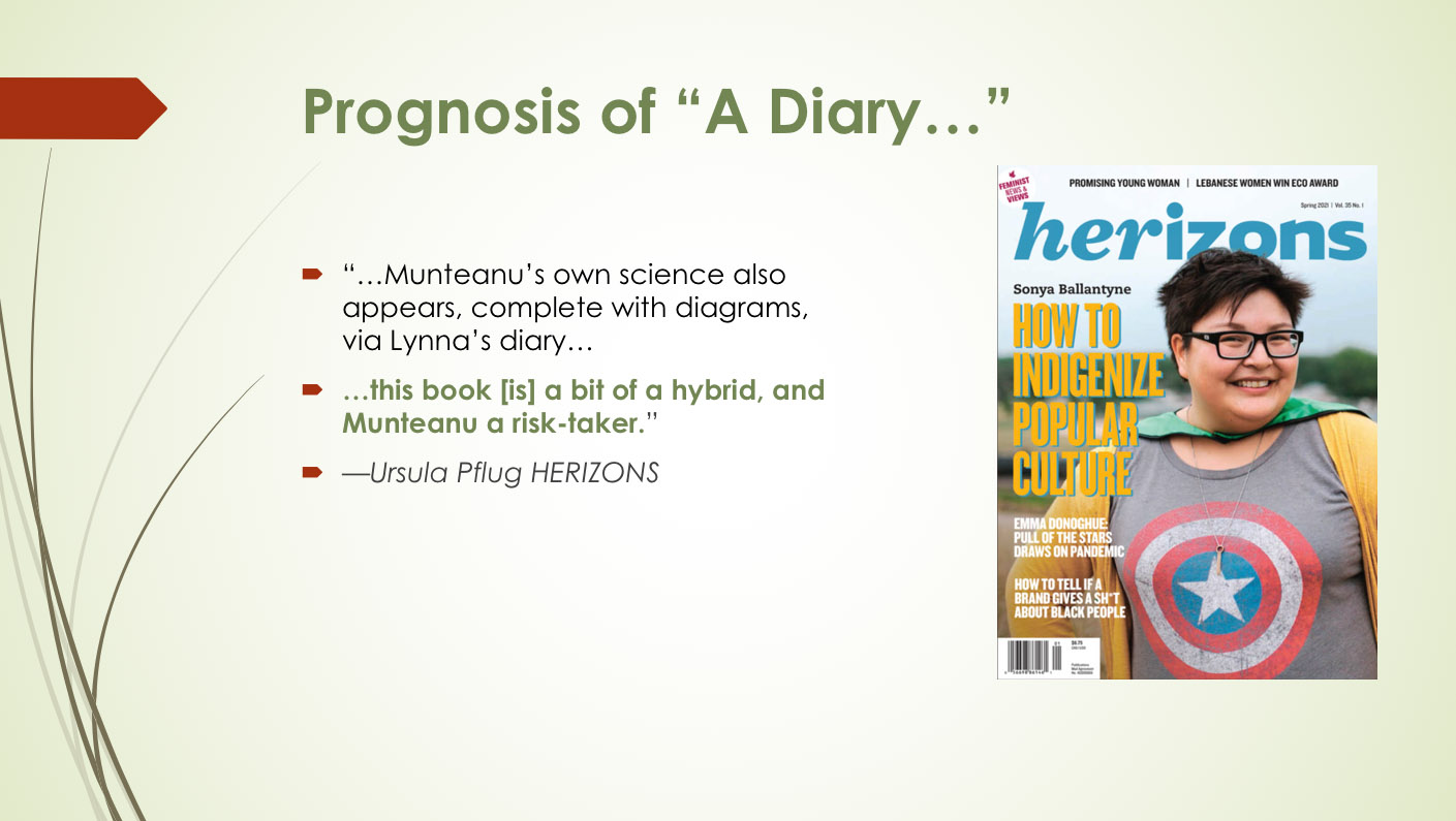 Munteanu “invites readers to recognize themselves in the ‘historical’ story and to project themselves into her imagined future…the diary…operates as a doorway…Munteanu combines methodologies, familiar literary motifs with text and images from non-fiction…She does not appear to view fiction and non-fiction as separate territories; or, if she does, then this book is a bridge between them.”