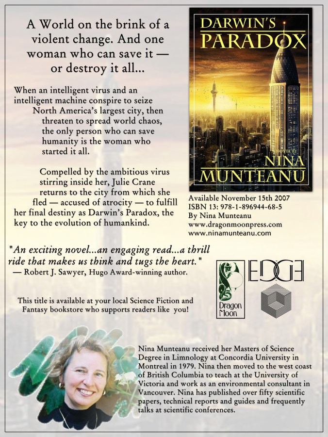 Nina Munteanu is a Canadian ecologist / limnologist and novelist. She is co-editor of Europa SF and currently teaches writing courses at George Brown College and the University of Toronto. Visit www.ninamunteanu.ca for the latest on her books. Nina’s bilingual “La natura dell’acqua / The Way of Water” was published by Mincione Edizioni in Rome. Her non-fiction book “Water Is…” by Pixl Press (Vancouver) was selected by Margaret Atwood in the New York Times ‘Year in Reading’ and was chosen as the 2017 Summer Read by Water Canada. Her novel “A Diary in the Age of Water” was released by Inanna Publications (Toronto) in June 2020.